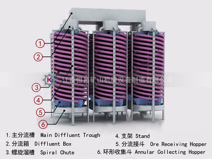 螺旋溜槽都有給礦均勻器、十字架(三腳架)、給礦槽、螺旋槽、截取槽、集聚斗、槽支柱組成。