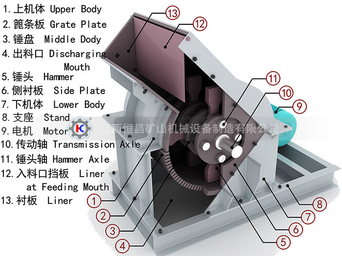 錘式破碎機由轉子、錘頭、傳動軸承、篩板、電機等部件組成。