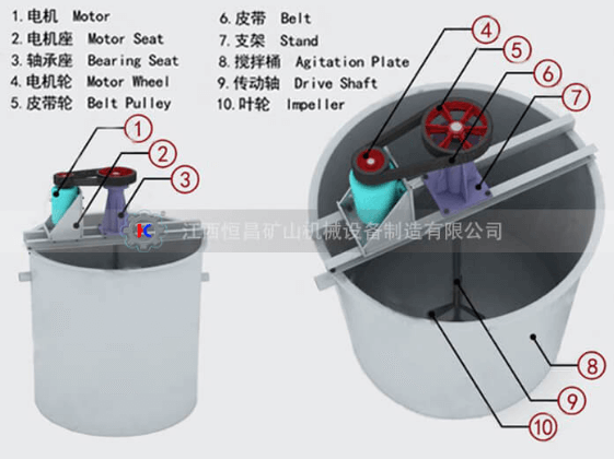 浮選藥劑攪拌桶設備主要由槽體、支架、電機、葉輪及傳動軸等組成。由電動機經皮帶,葉輪軸帶動葉輪旋轉進行工作,礦漿和浮選藥劑在葉輪產生的離心力和升力作用下在槽內循環運動,從而使藥劑均勻在分布于礦漿之中。